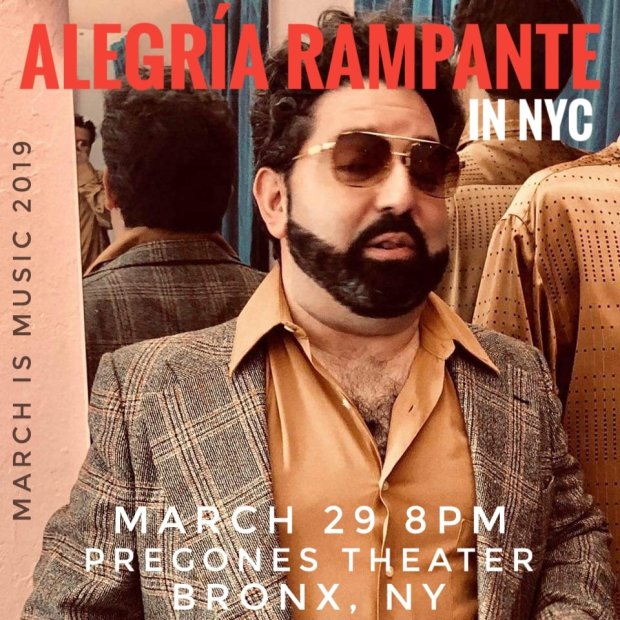Alegría Rampante regresa a NYC! Con motivo de la nueva serie de conciertos Marzo es Música, la banda puertorriqueña trae su nueva propuesta musical en un concierto el próximo viernes, 29 de marzo, en el Teatro Pregones en el Bronx, NY. Alegría Rampante está compuesto por Eduardo Alegría, Kristian (Harry Rag) Prieto, Juan Antonio Arroyo, Nitayno Arayoán, y William Jorell Román. El proyecto musical creado por Eduardo Alegría, cantante, compositor y ex-miembro del grupo de rock alternativo Superaquello. Alegía, reconocido como uno de los líderes y fundadores de la escena independiente de Puerto Rico.